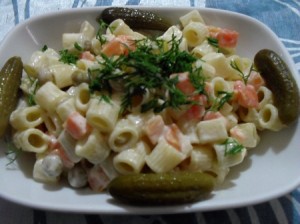 Makarnayı bir miktar tuz ile haşlıyoruz. Haşlandıktan sonra suyunu süzerek bir kaba alıyoruz. Üzerine yarım kavanoz garnitürü döküyoruz ve iyice karıştırıyoruz. İsteyen arkadaşlar mısırda ekleyebilirler. Başka bir kapta yoğurt, mayonez ve dövülmüş sarmısağı karıştırıp makarnanın üzerine döküyoruz. Tuzunu da ayarlayarak tekrar karıştırıyoruz.