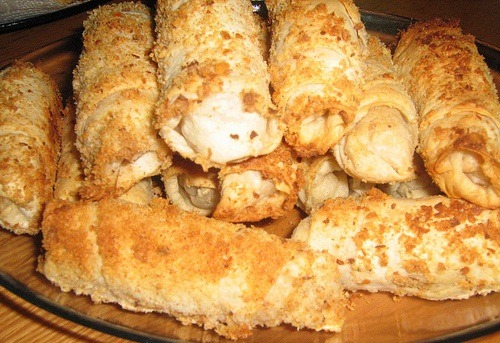 But haşlanıp soğumaya bırakılır. 2 Adet yufka eritilmiş tereyağı ile yağlanıp fırın ızgarasında kızartılıp bırakılır. Üzerine ılık tavuk suyu dökülerek ıslatılır. Tavuk eti karabiber ve çekilmiş ceviz karıştırılarak yufkanın ortasına yayılıp rulo yapılır 180 derecede ısıtılmış fırına verilir. Üzeri kızardıktan sonra fırından çıkarılıp üzerine kaşar peyniri dökülüp peynirler eriyene kadar tekrar fırına verilir.